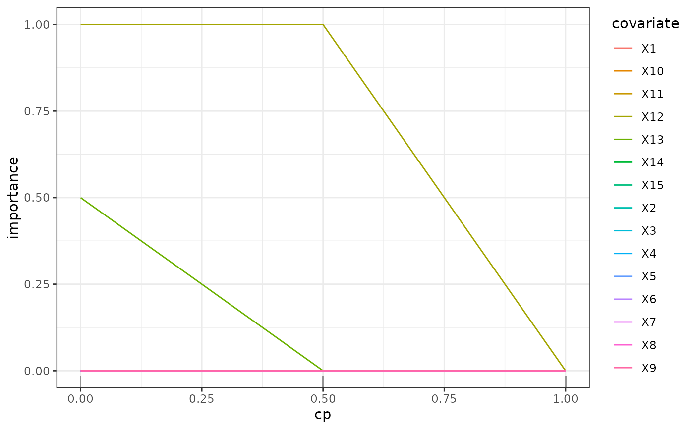 simulate_data_step.RdSimulation of data from a confounded non-linear model. Where the non-linear function is a random regression tree. The data generating process is given by: $$Y = f(X) + \delta^T H + \nu$$ $$X = \Gamma^T H + E$$ where \(f(X)\) is a random regression tree with \(m\) random splits of the data. Resulting in a random step-function with \(m+1\) levels, i.e. leaf-levels. $$f(x_i) = \sum_{k = 1}^K 1_{\{x_i \in R_k\}} c_k$$ \(E\), \(\nu\) are random error terms and \(H \in \mathbb{R}^{n \times q}\) is a matrix of random confounding covariates. \(\Gamma \in \mathbb{R}^{q \times p}\) and \(\delta \in \mathbb{R}^{q}\) are random coefficient vectors. For the simulation, all the above parameters are drawn from a standard normal distribution, except for \(\delta\) which is drawn from a normal distribution with standard deviation 10. For a split a covariate is sampled uniformly and split at a random point using a beta distribution (with both shape parameters equal 2) on the support of the chosen covariate. The leaf levels \(c_k\) are drawn from a uniform distribution between \(cl\) and \(cu\).